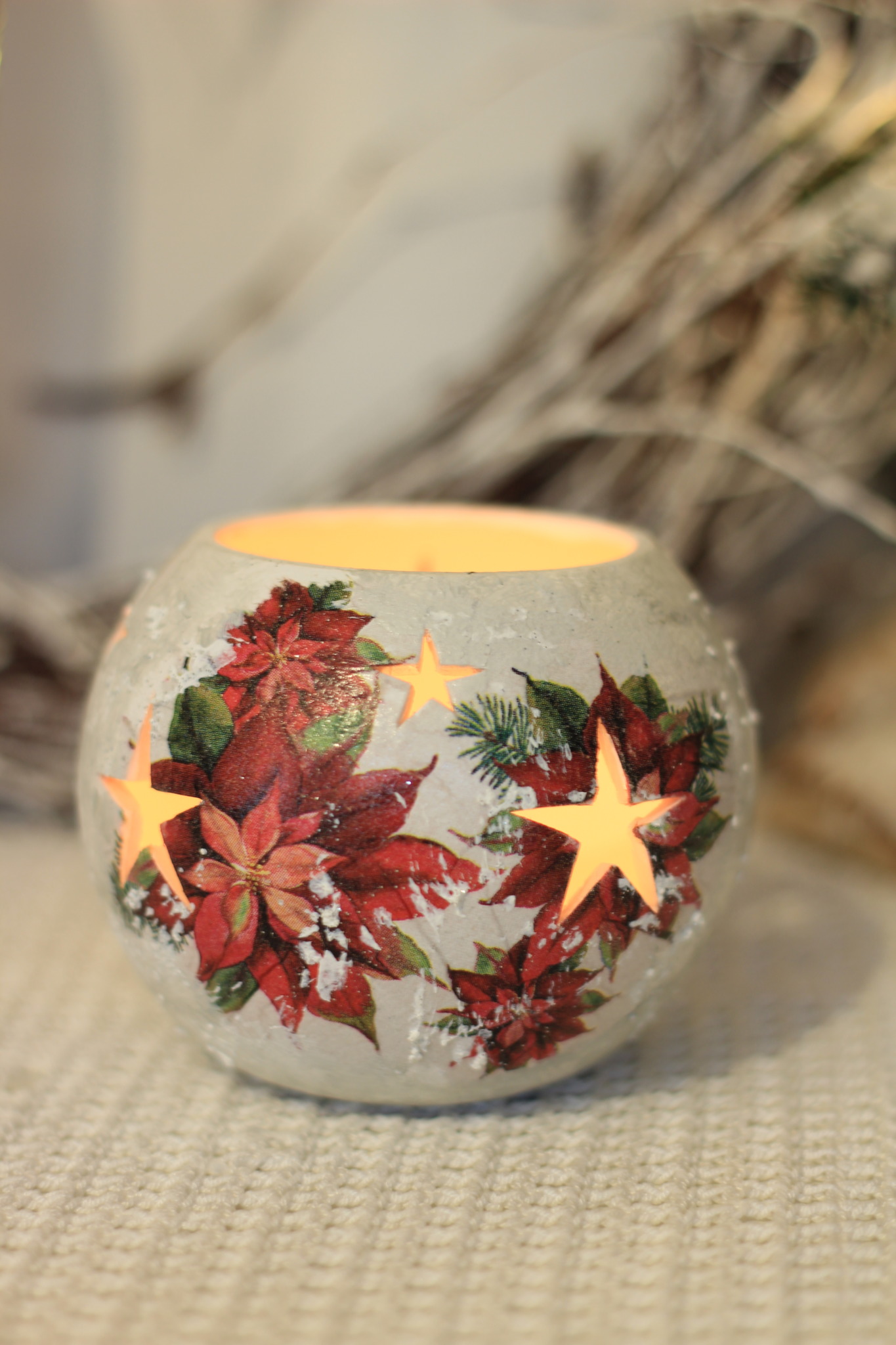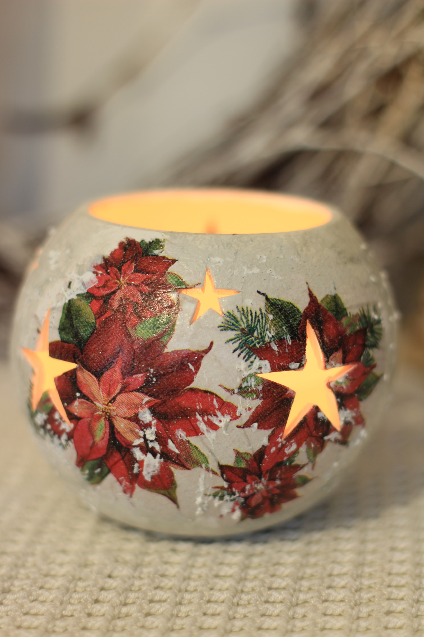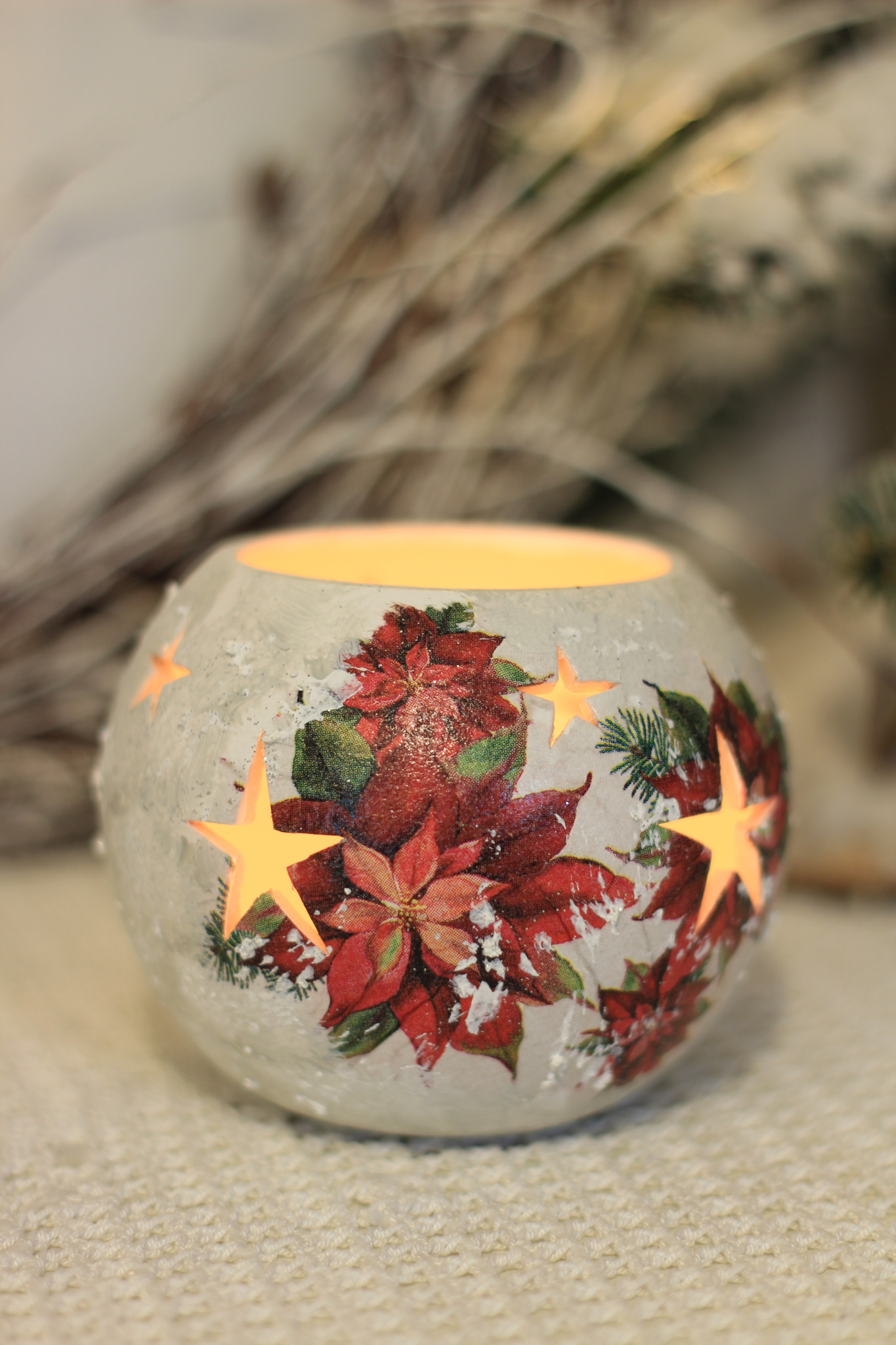 - Ceramiczny lampion bożonarodzeniowy zdobiony metodą Decoupage oraz techniką własną. Lampion po obu stronach przedstawia taki sam motyw. Do rozświetlenia lampionu najlepiej nadają się świeczki typu tealight. Lampiony są idealną świąteczną ozdobą na stół, parapet lub kominek.