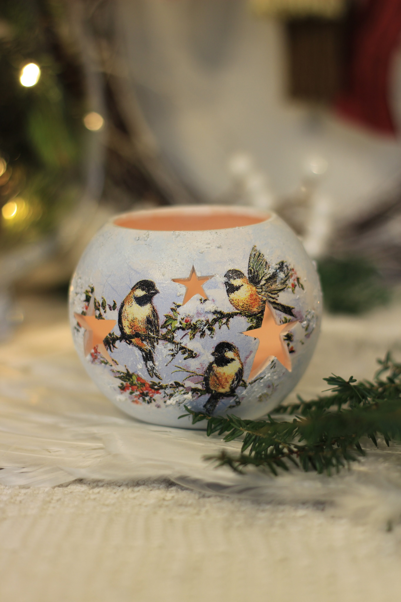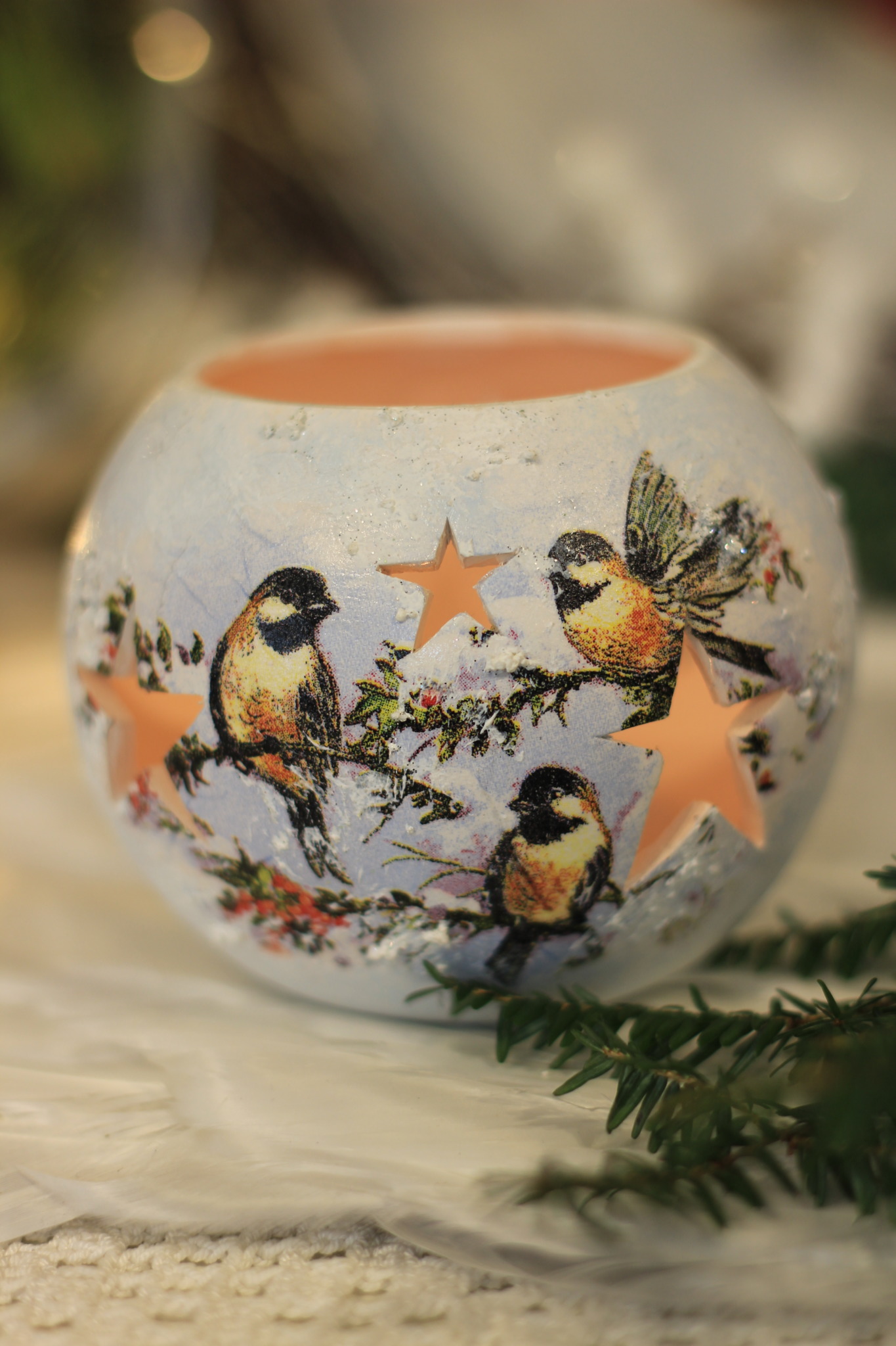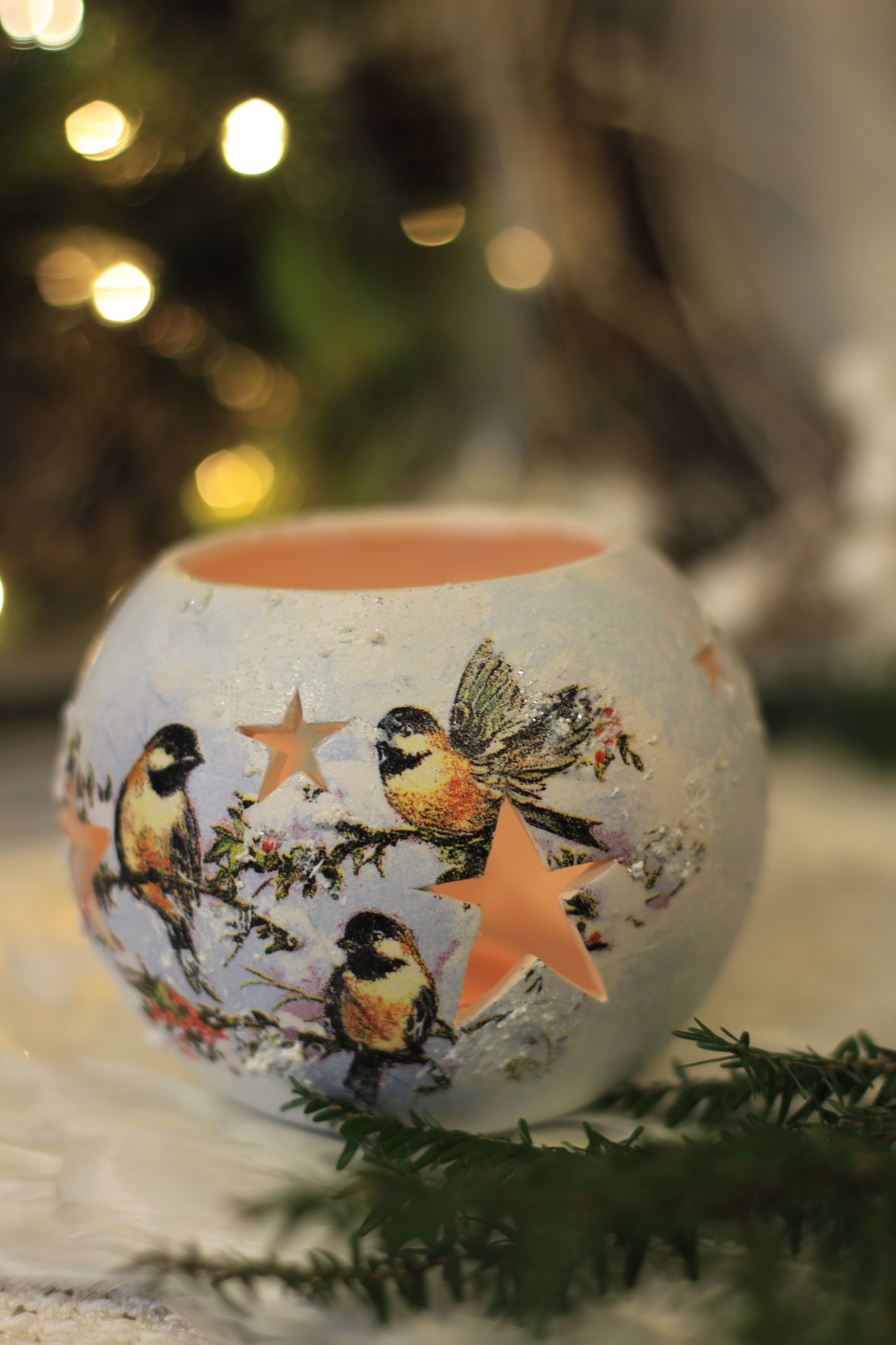 - Ceramiczny lampion bożonarodzeniowy zdobiony metodą Decoupage oraz techniką własną. Lampion po obu stronach przedstawia taki sam motyw. Do rozświetlenia lampionu najlepiej nadają się świeczki typu tealight. Lampiony są idealną świąteczną ozdobą na stół, parapet lub kominek.