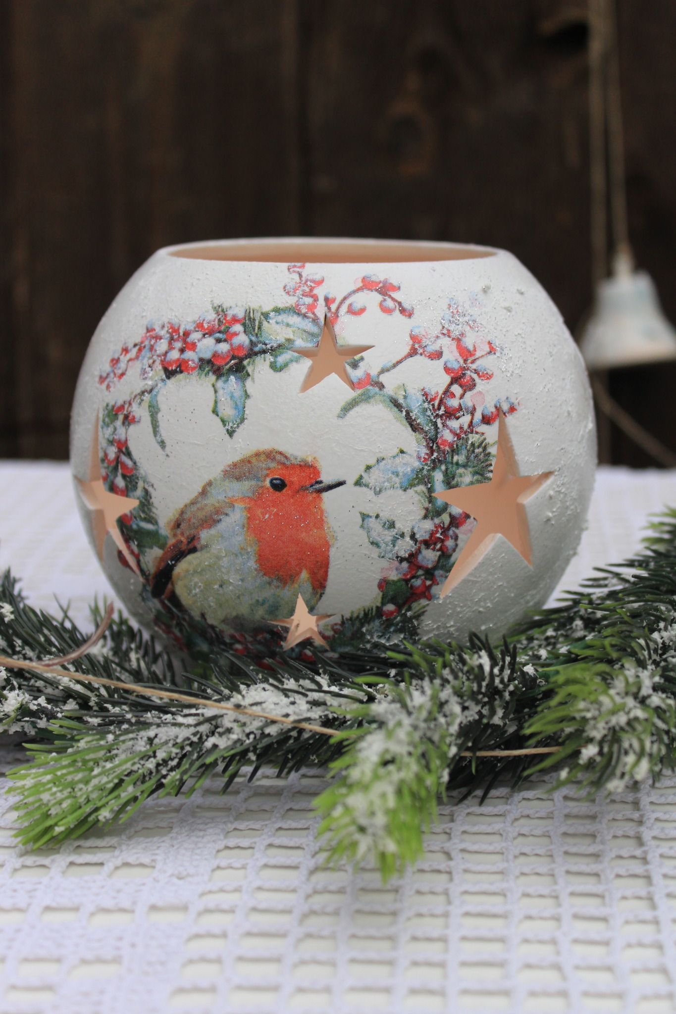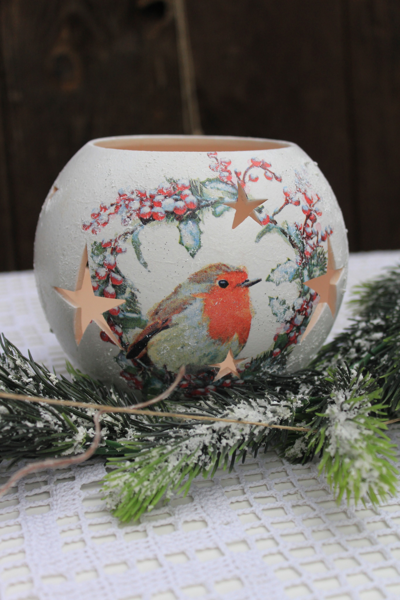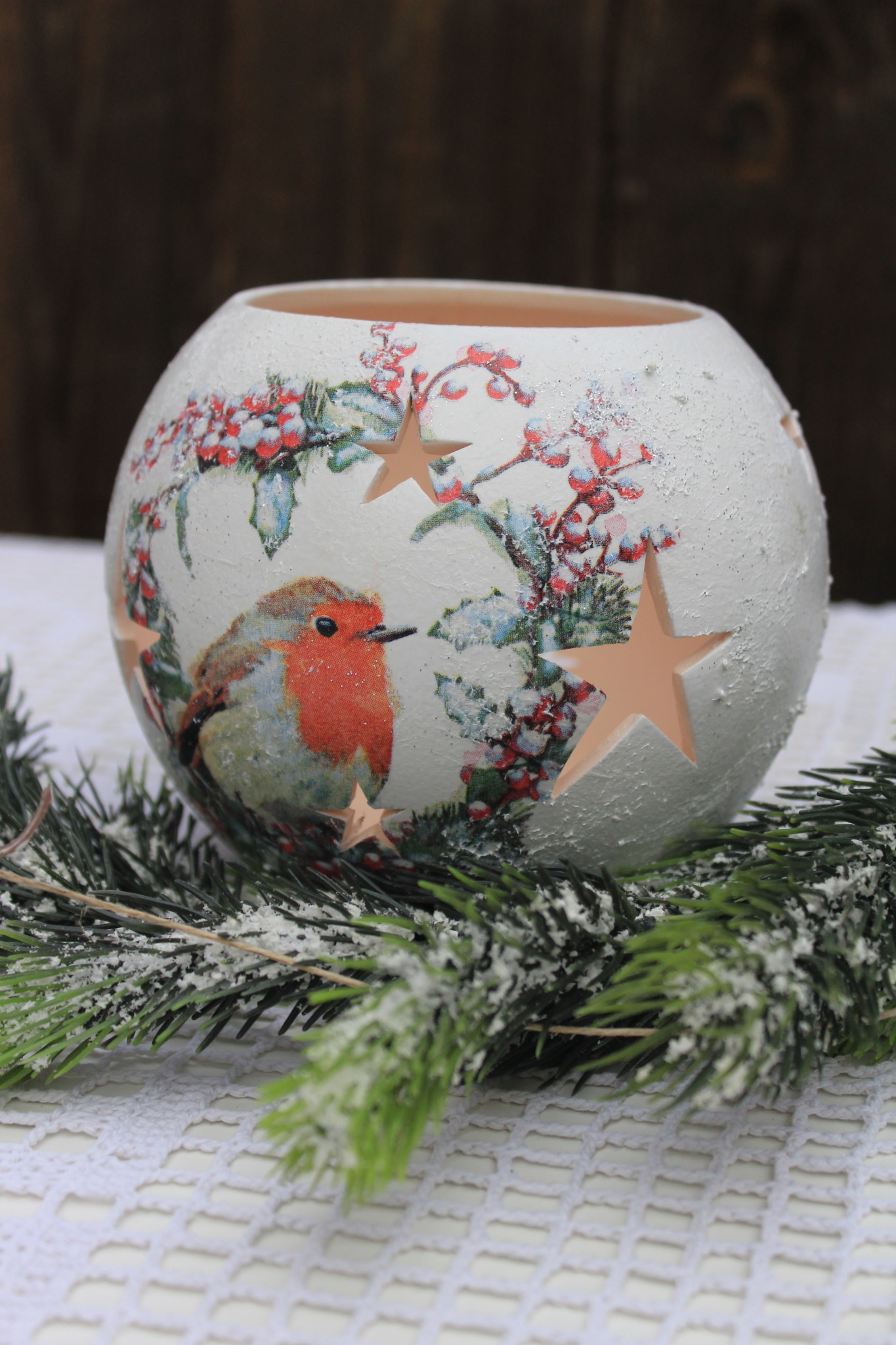 - Ceramiczny lampion bożonarodzeniowy zdobiony metodą Decoupage oraz techniką własną. Lampion po obu stronach przedstawia taki sam motyw. Do rozświetlenia lampionu najlepiej nadają się świeczki typu tealight. Lampiony są idealną świąteczną ozdobą na stół, parapet lub kominek.