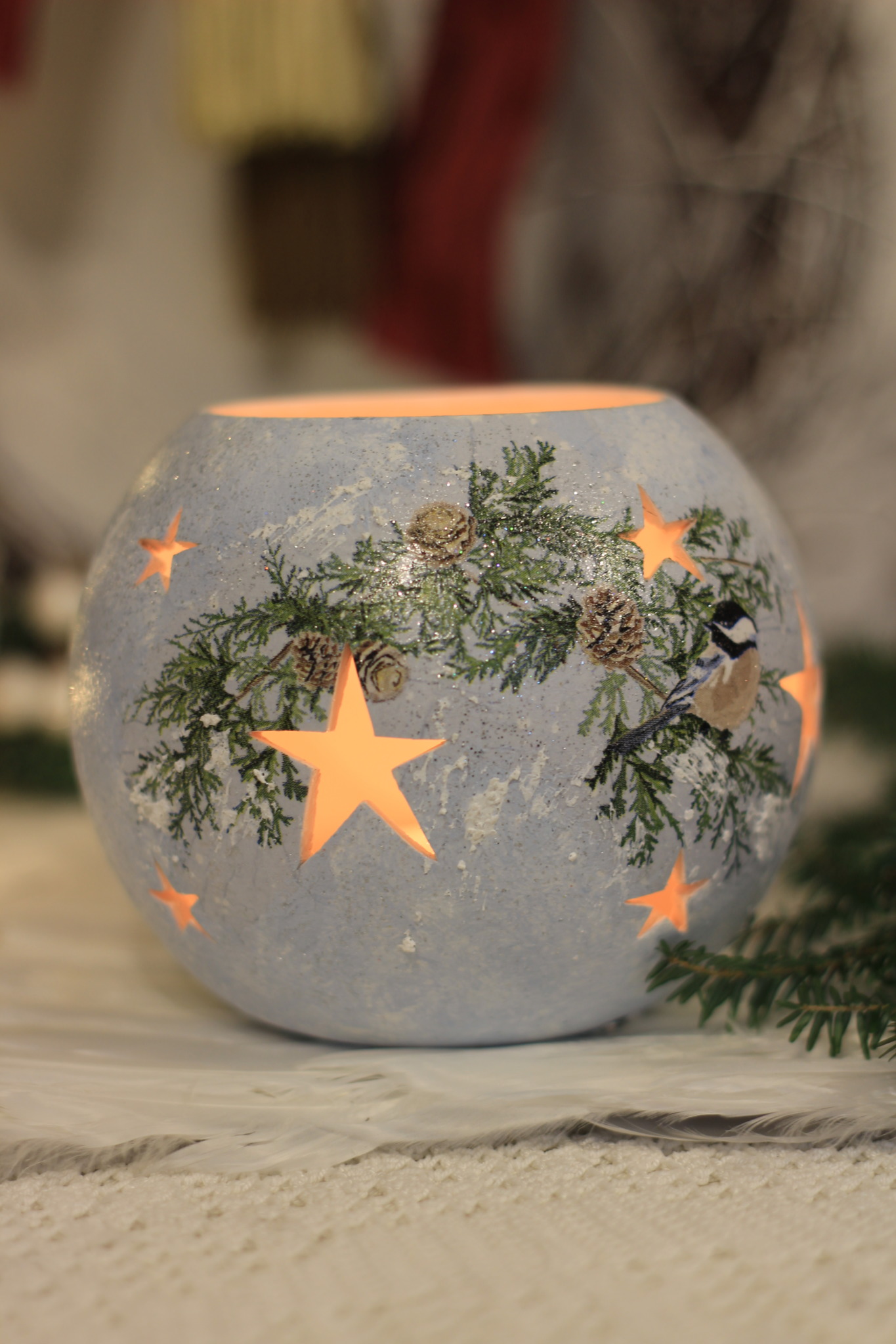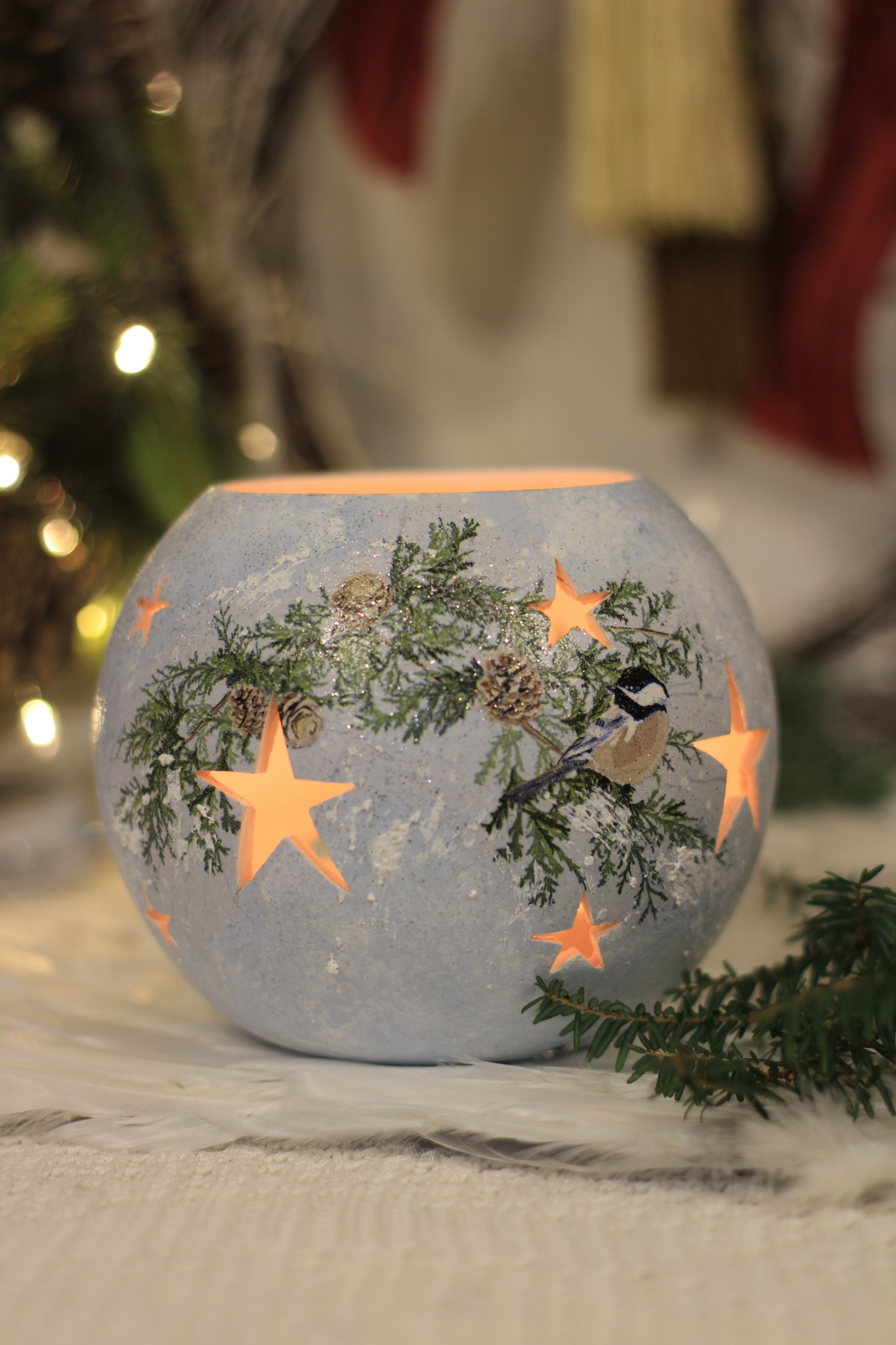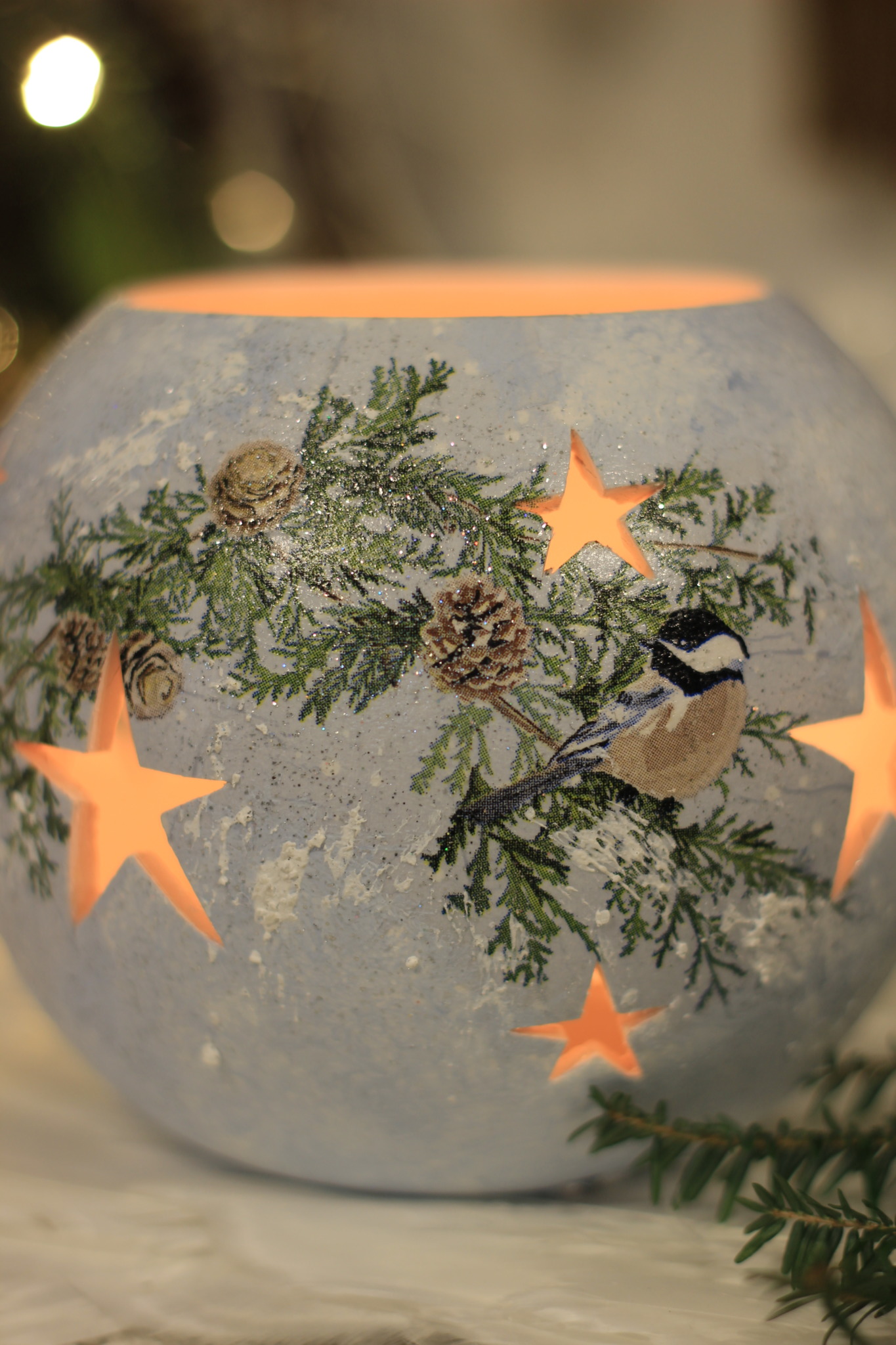 - Ceramiczny lampion bożonarodzeniowy zdobiony metodą Decoupage oraz techniką własną. Lampion po obu stronach przedstawia taki sam motyw. Do rozświetlenia lampionu najlepiej nadają się świeczki typu tealight. Lampiony są idealną świąteczną ozdobą na stół, parapet lub kominek.