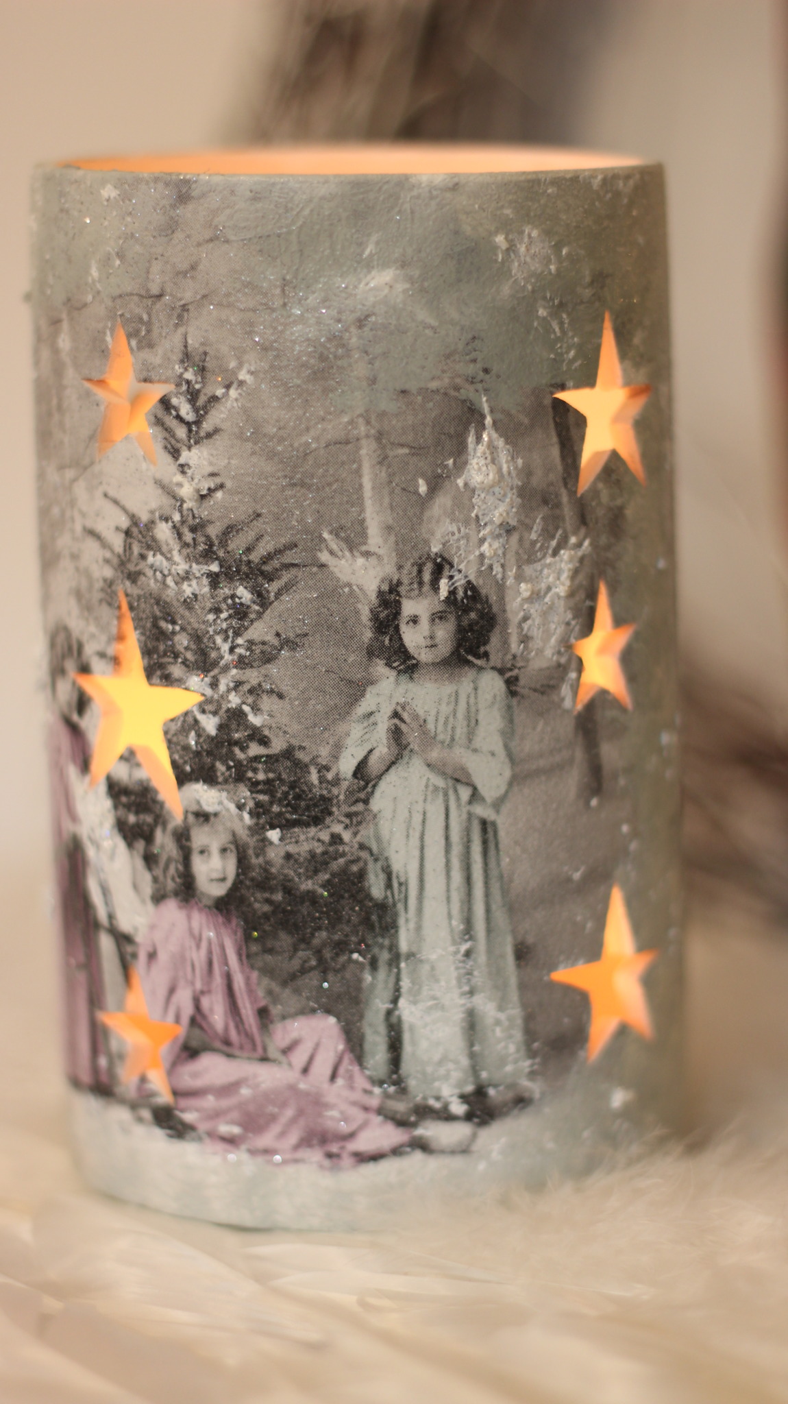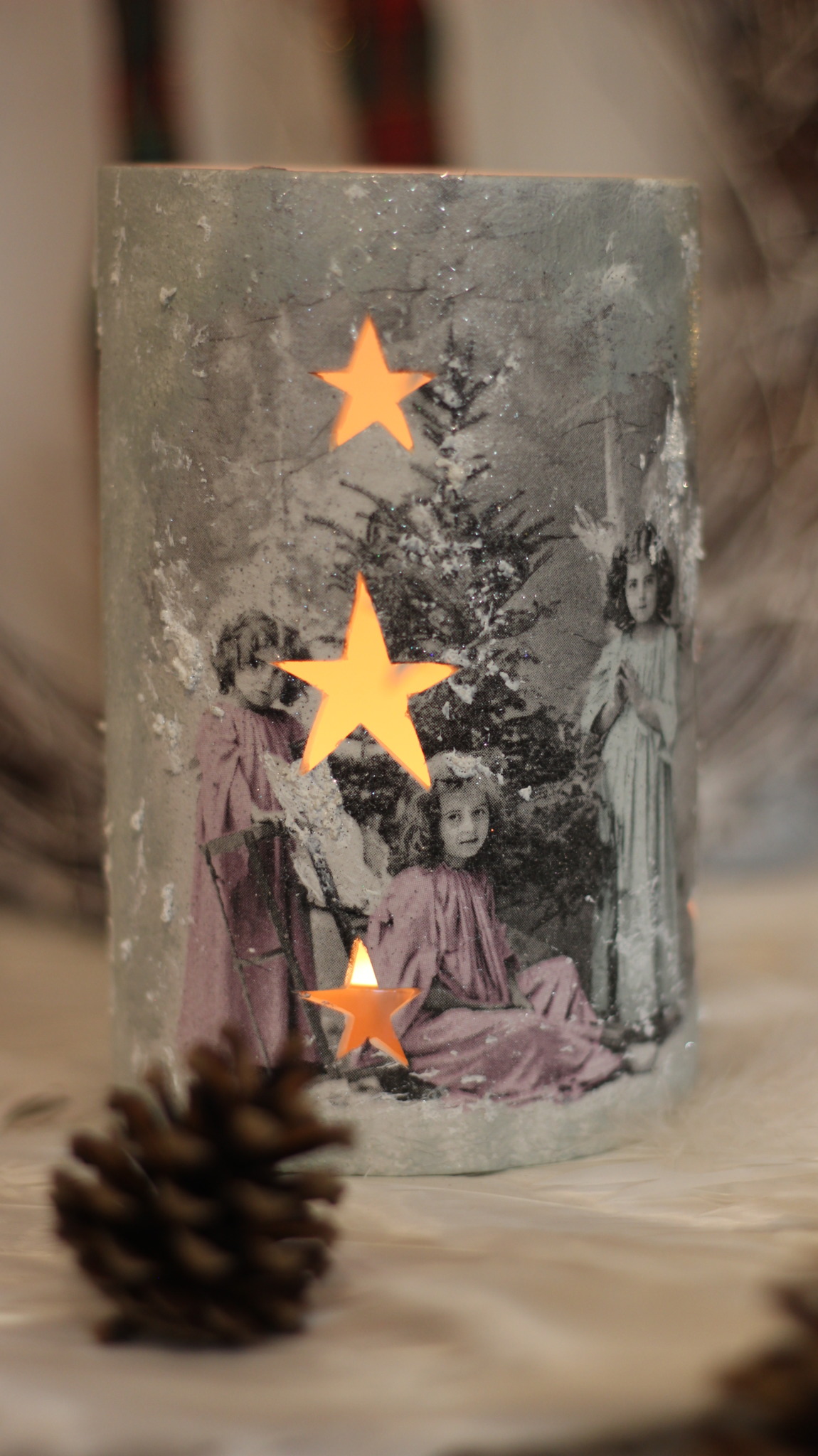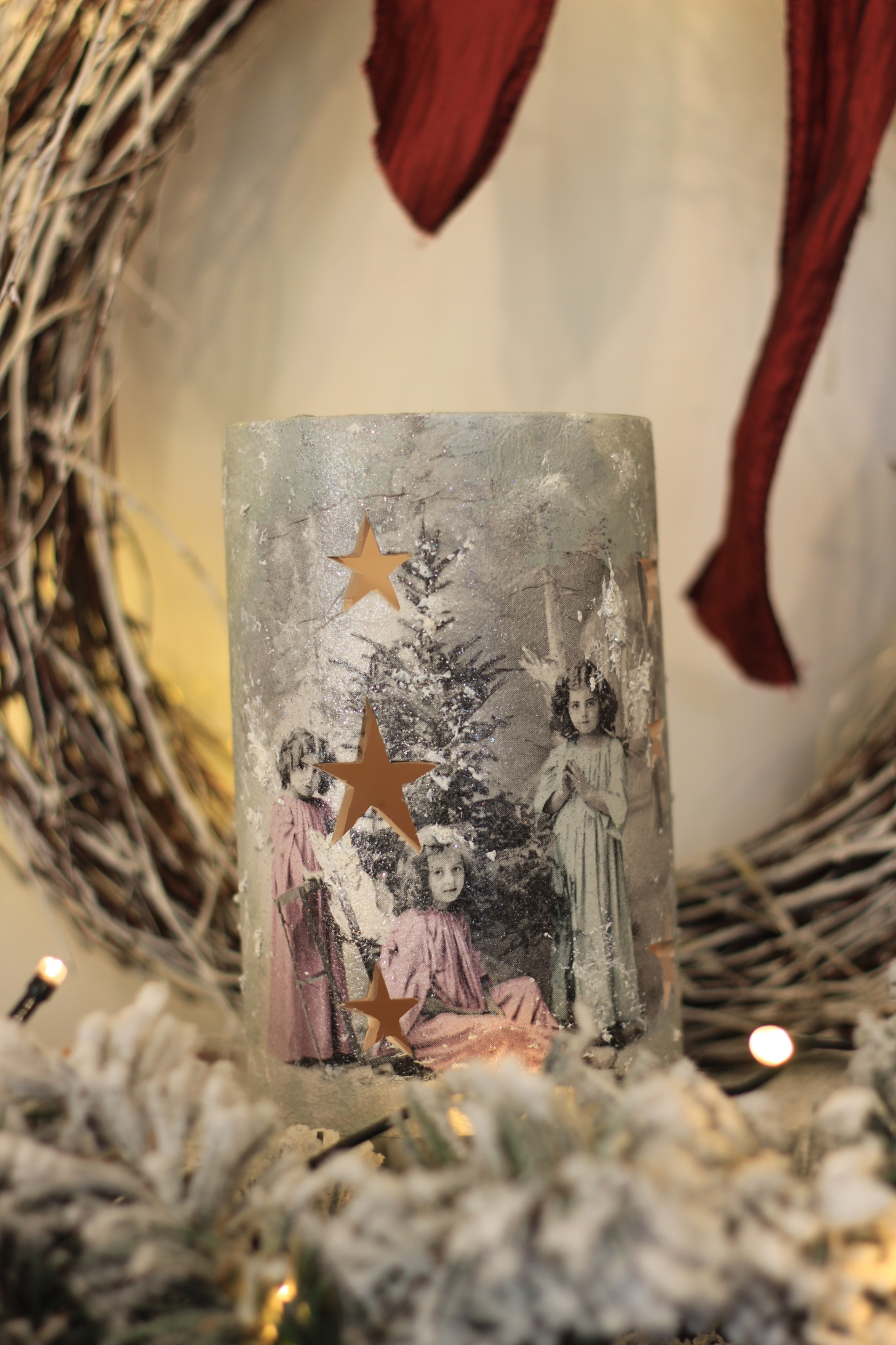 - Ceramiczny lampion bożonarodzeniowy w kształcie tulei zdobiony metodą Decoupage oraz techniką własną. Lampion po obu stronach przedstawia taki sam motyw. Do rozświetlenia lampionu najlepiej nadają się świeczki typu tealight. Lampiony są idealną świąteczną ozdobą na stół, parapet lub kominek.