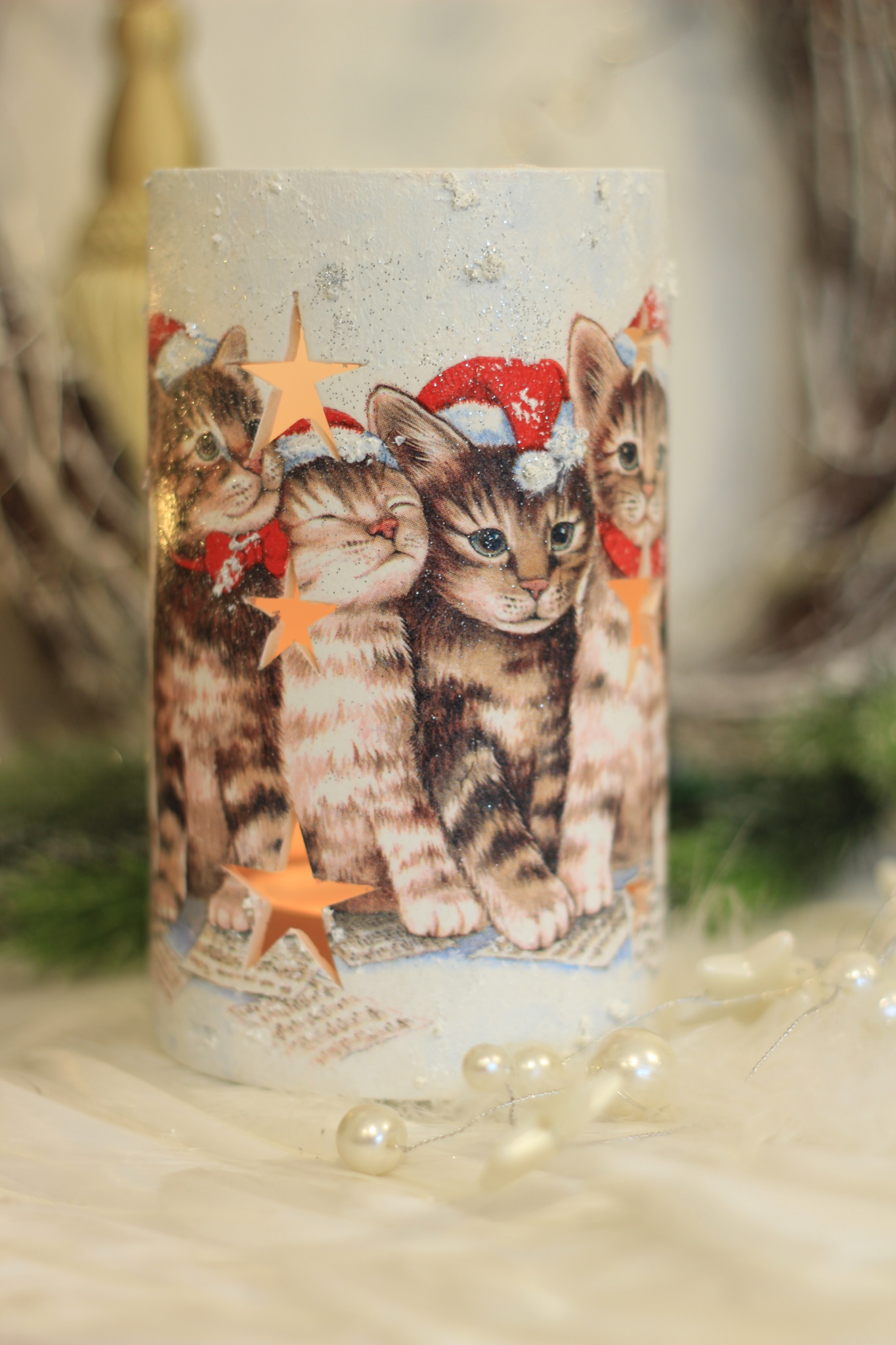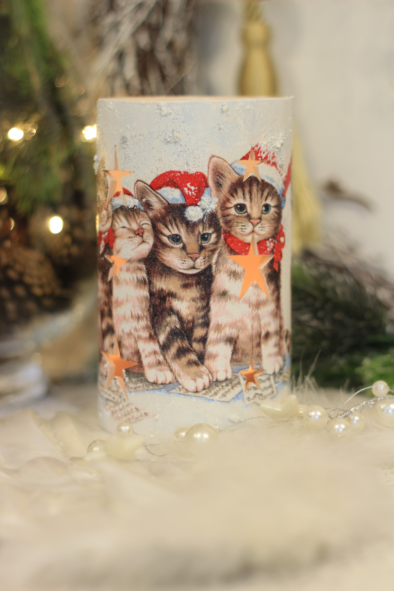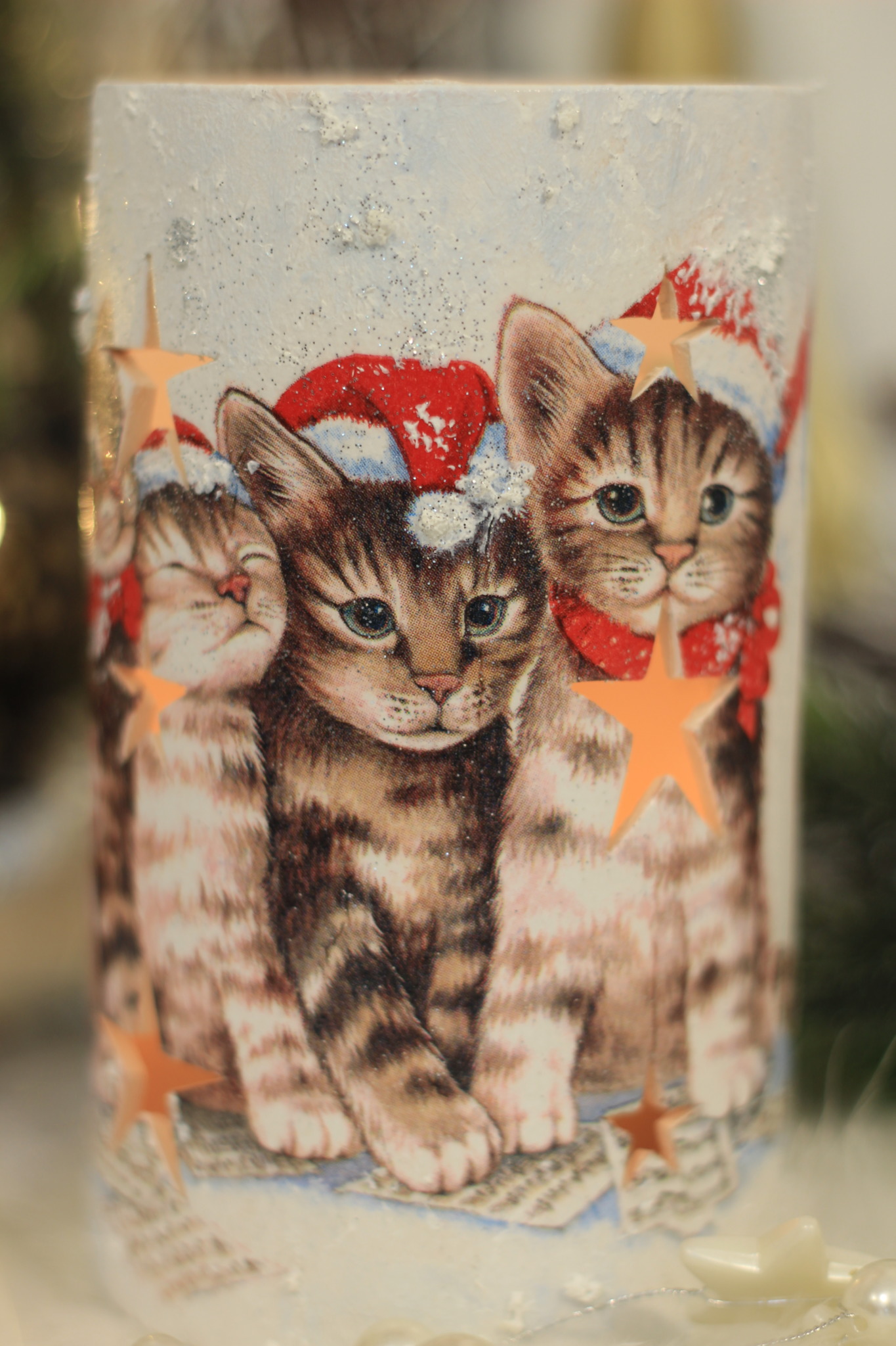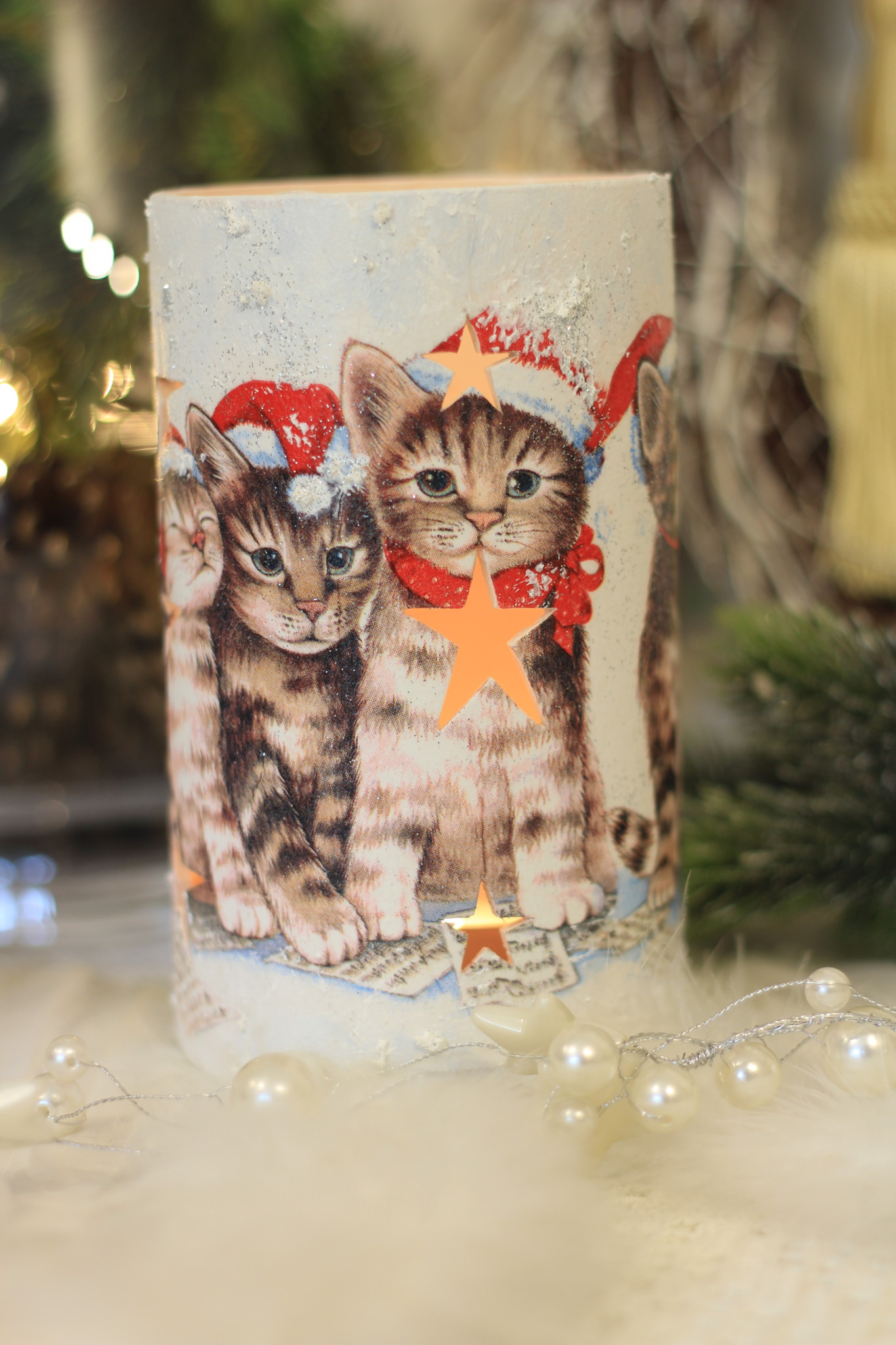 - Ceramiczny lampion bożonarodzeniowy w kształcie tulei zdobiony metodą Decoupage oraz techniką własną. Lampion po obu stronach przedstawia taki sam motyw. Do rozświetlenia lampionu najlepiej nadają się świeczki typu tealight. Lampiony są idealną świąteczną ozdobą na stół, parapet lub kominek.