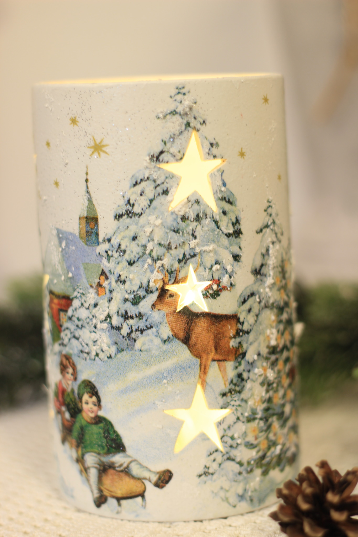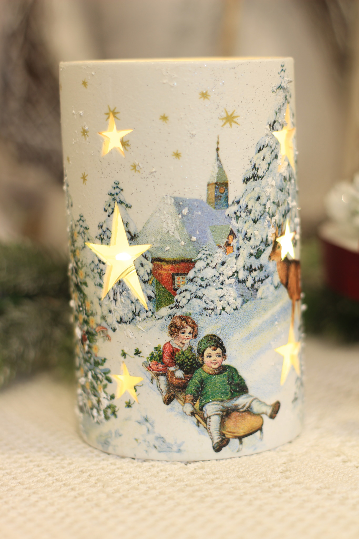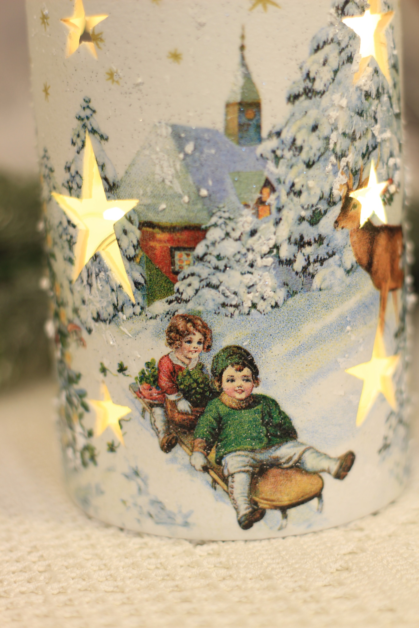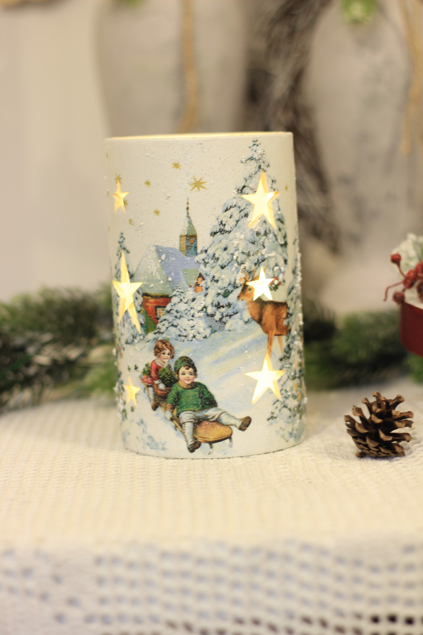 - Ceramiczny lampion bożonarodzeniowy w kształcie tulei zdobiony metodą Decoupage oraz techniką własną. Lampion po obu stronach przedstawia taki sam motyw. Do rozświetlenia lampionu najlepiej nadają się świeczki typu tealight. Lampiony są idealną świąteczną ozdobą na stół, parapet lub kominek.