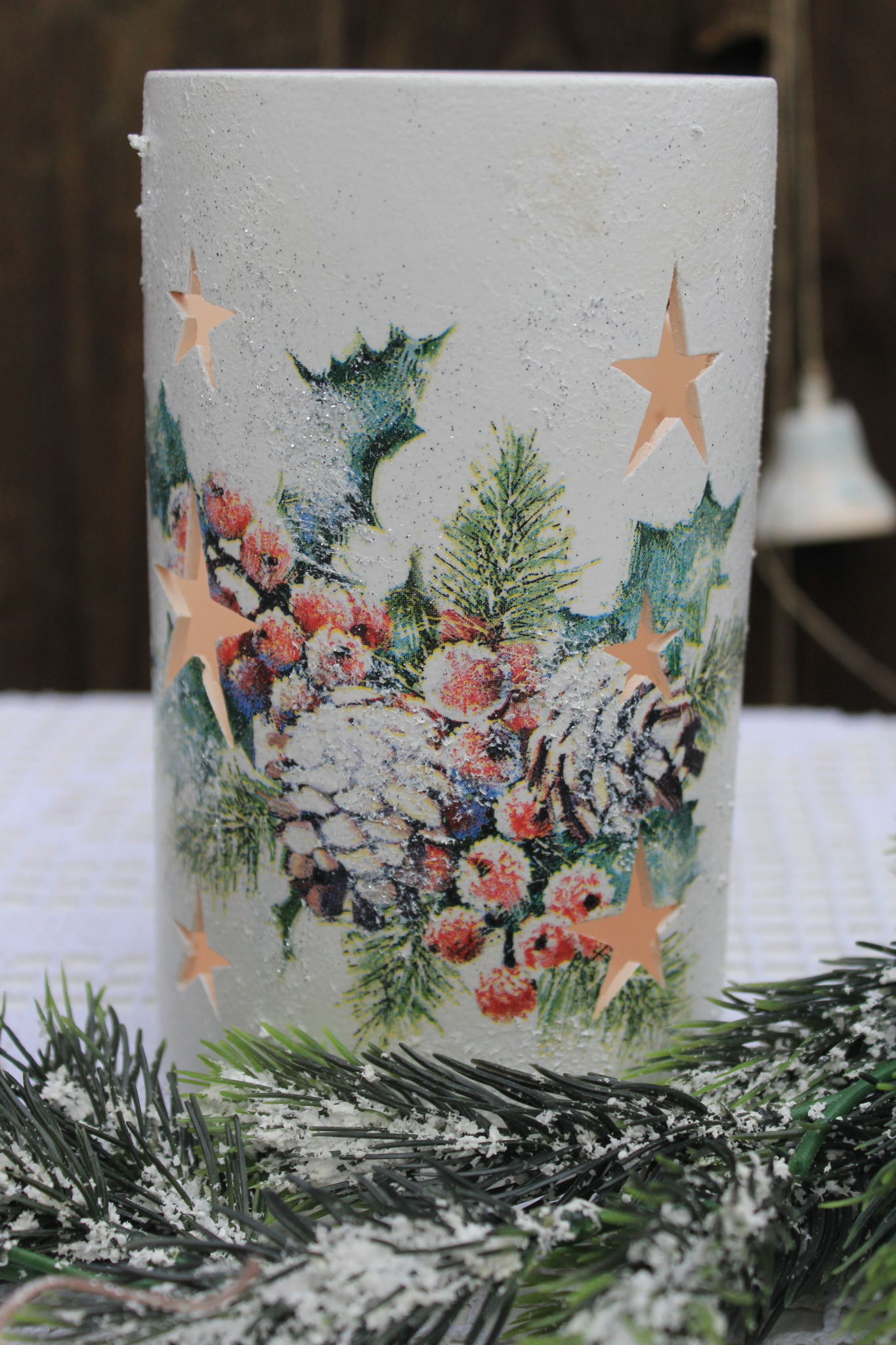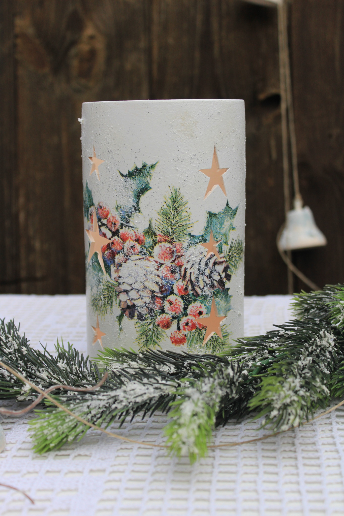 - Ceramiczny lampion bożonarodzeniowy w kształcie tulei zdobiony metodą Decoupage oraz techniką własną. Lampion po obu stronach przedstawia taki sam motyw. Do rozświetlenia lampionu najlepiej nadają się świeczki typu tealight. Lampiony są idealną świąteczną ozdobą na stół, parapet lub kominek.
