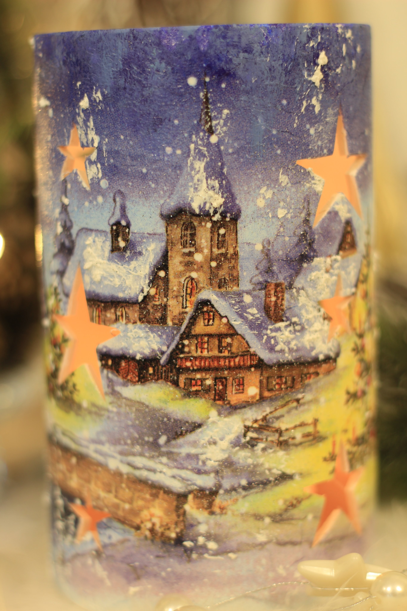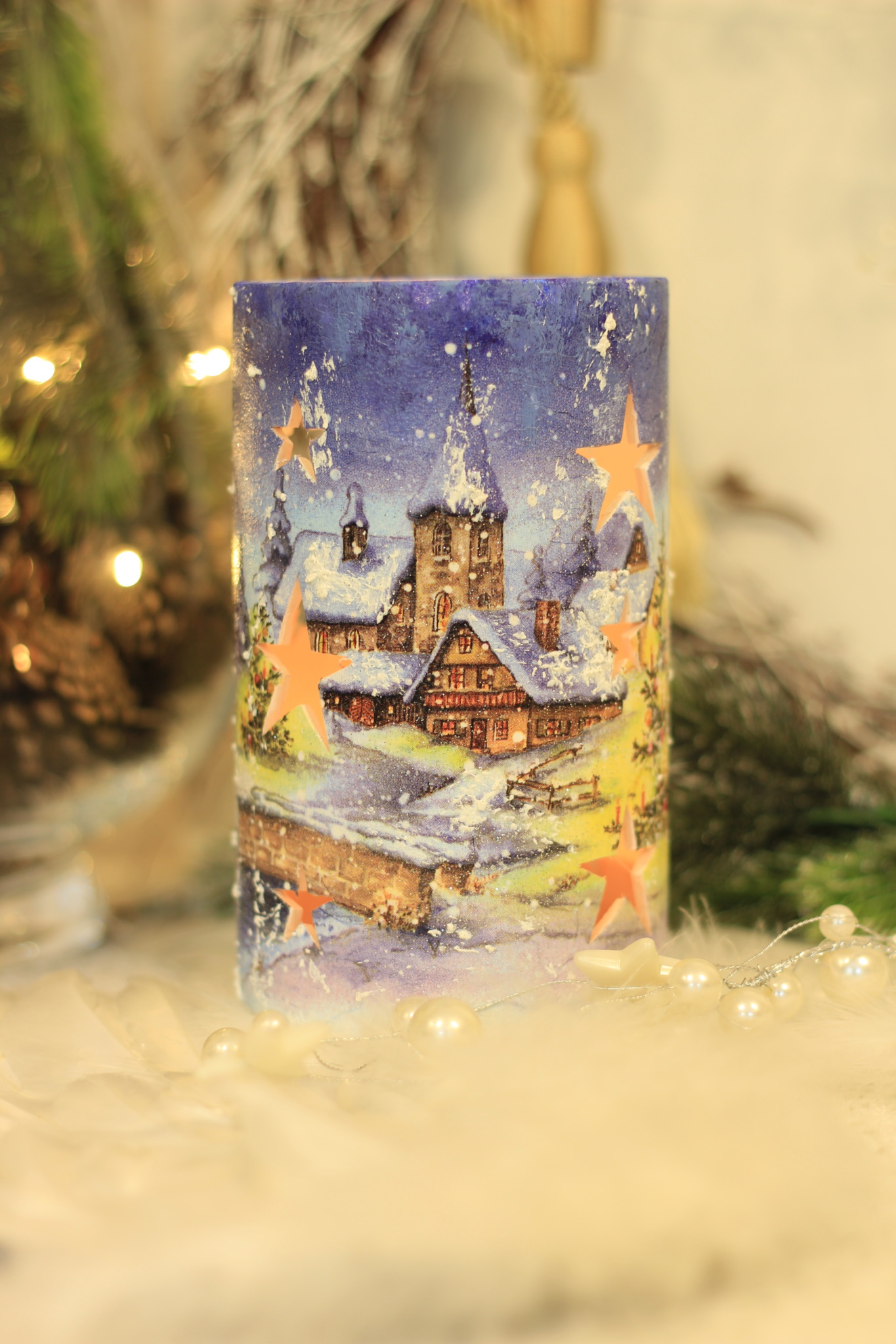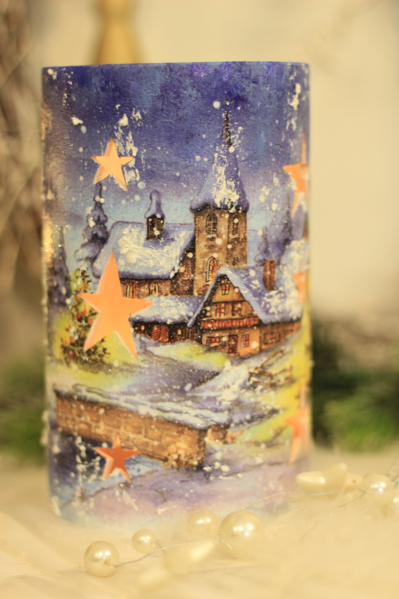 - Ceramiczny lampion bożonarodzeniowy w kształcie tulei zdobiony metodą Decoupage oraz techniką własną. Lampion po obu stronach przedstawia taki sam motyw. Do rozświetlenia lampionu najlepiej nadają się świeczki typu tealight. Lampiony są idealną świąteczną ozdobą na stół, parapet lub kominek.